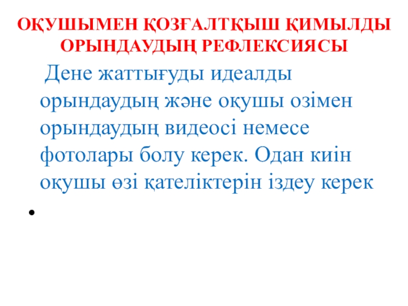 Слайд 10ОҚУШЫМЕН ҚОЗҒАЛТҚЫШ ҚИМЫЛДЫ ОРЫНДАУДЫҢ РЕФЛЕКСИЯСЫ