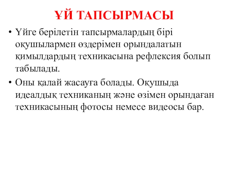 Үйге берілетін тапсырмалардың бірі оқушылармен өздерімен орындалатын қимылдардың техникасына рефлексия