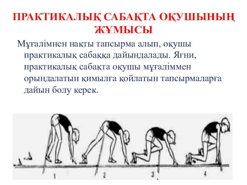 дайындалады. Яғни, практикалық сабақта оқушы мұғаліммен орындалатын қимылға қойлатын тапсырмаларға дайын болу керек.
