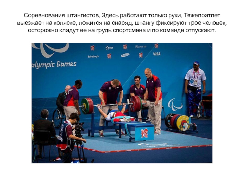 Слайд 33Соревнования штангистов. Здесь работают только руки. Тяжелоатлет выезжает на коляске, ложится