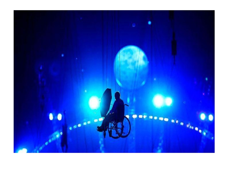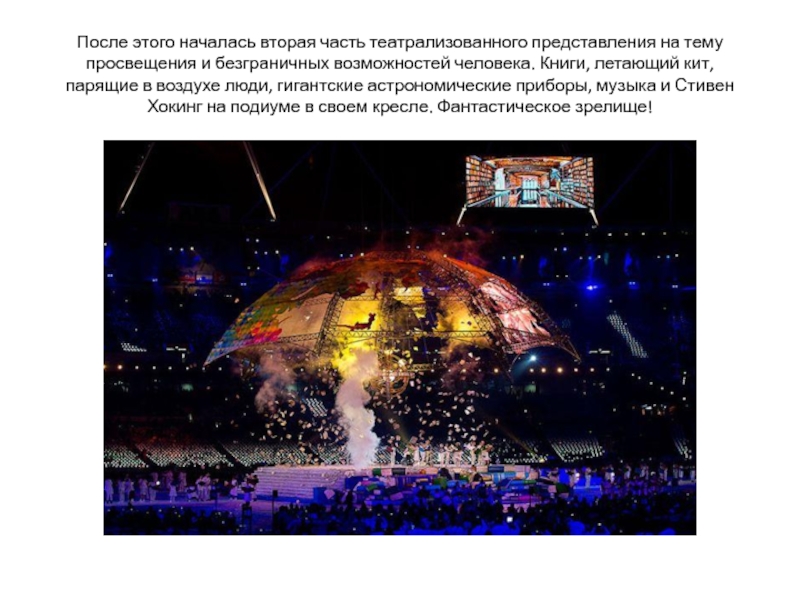 безграничных возможностей человека. Книги, летающий кит, парящие в воздухе люди, гигантские астрономические приборы, музыка и Стивен Хокинг на подиуме в своем кресле. Фантастическое зрелище!