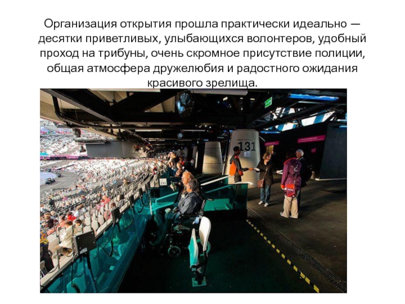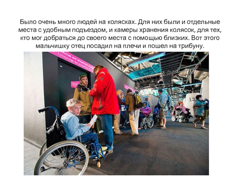 Слайд 4Было очень много людей на колясках. Для них были и отдельные