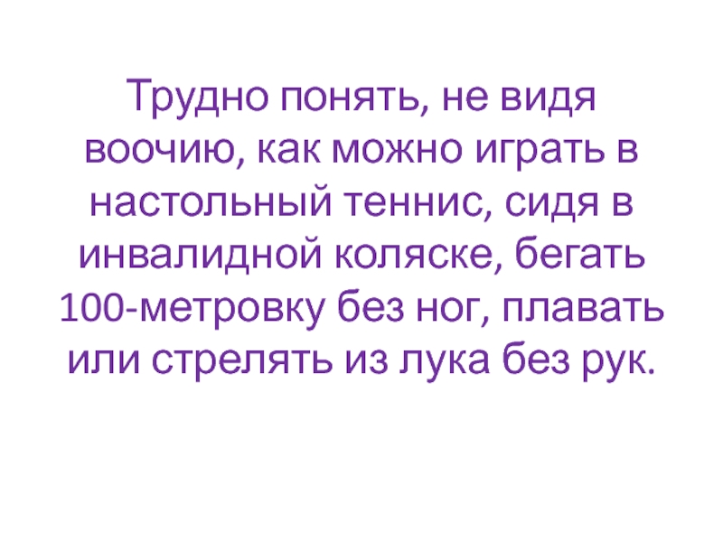 сидя в инвалидной коляске, бегать 100-метровку без ног, плавать или стрелять из лука без рук.