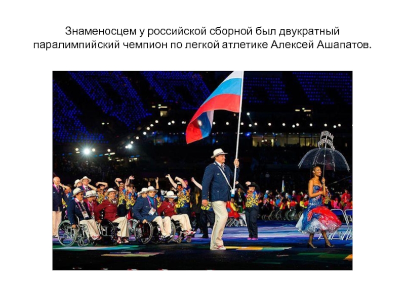 Слайд 16Знаменосцем у российской сборной был двукратный паралимпийский чемпион по легкой атлетике