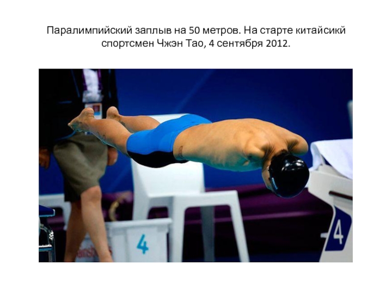 Слайд 37Паралимпийский заплыв на 50 метров. На старте китайсикй спортсмен Чжэн Тао,