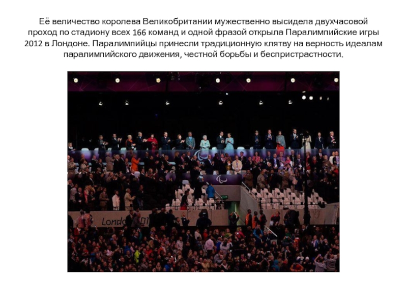 Слайд 18Её величество королева Великобритании мужественно высидела двухчасовой проход по стадиону всех