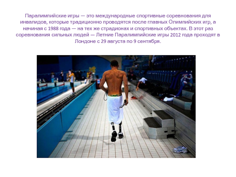 Слайд 2Паралимпийские игры — это международные спортивные соревнования для инвалидов, которые традиционно