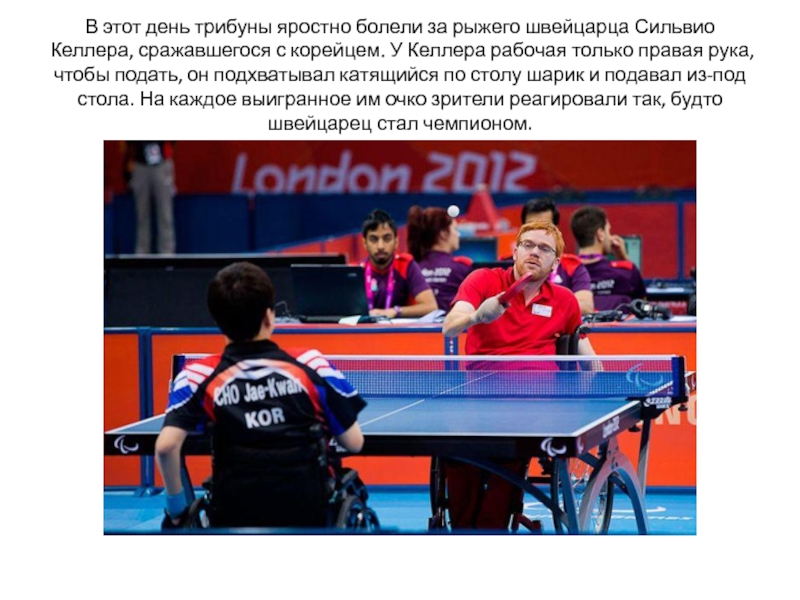 сражавшегося с корейцем. У Келлера рабочая только правая рука, чтобы подать, он подхватывал катящийся по столу шарик и подавал из-под стола. На каждое выигранное им очко зрители реагировали так, будто швейцарец стал чемпионом.