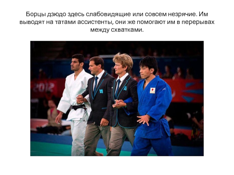 Слайд 34Борцы дзюдо здесь слабовидящие или совсем незрячие. Им выводят на татами