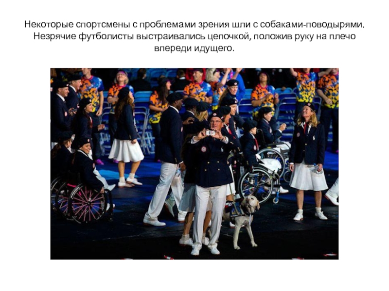 Слайд 17Некоторые спортсмены с проблемами зрения шли с собаками-поводырями. Незрячие футболисты выстраивались