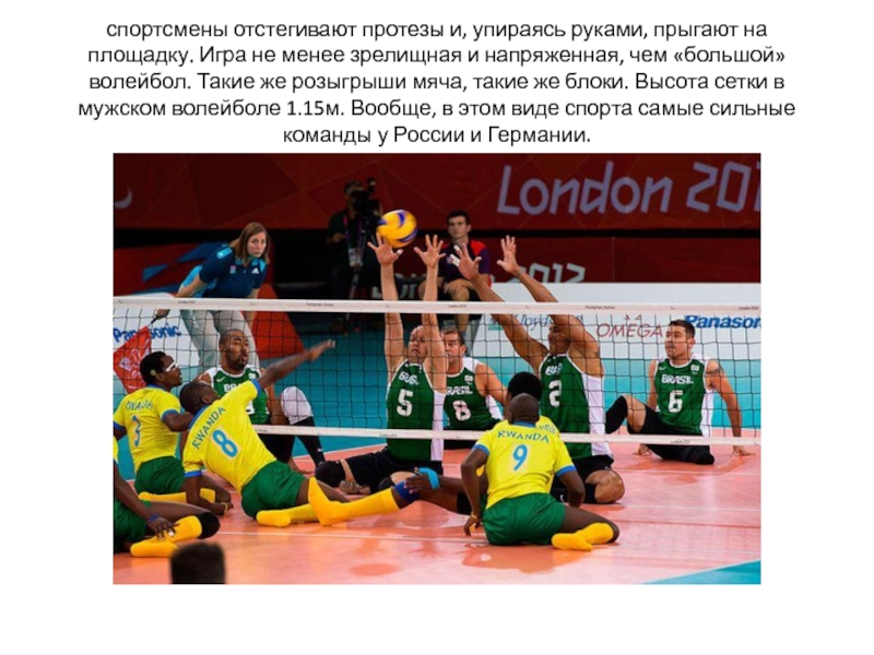 Слайд 32спортсмены отстегивают протезы и, упираясь руками, прыгают на площадку. Игра не