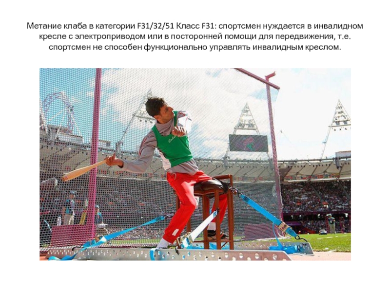 Слайд 40Метание клаба в категории F31/32/51 Класс F31: спортсмен нуждается в инвалидном