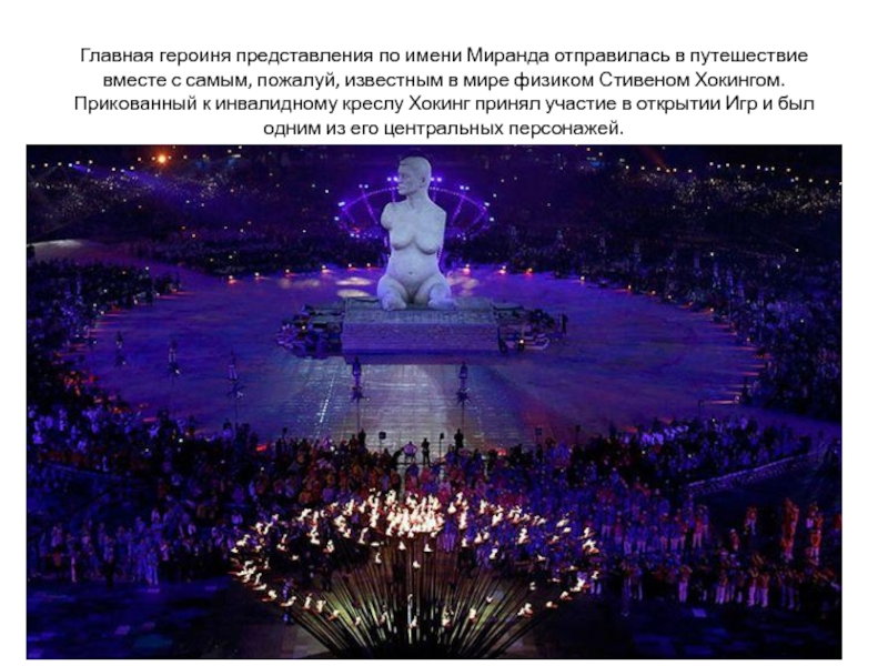 самым, пожалуй, известным в мире физиком Стивеном Хокингом. Прикованный к инвалидному креслу Хокинг принял участие в открытии Игр и был одним из его центральных персонажей.