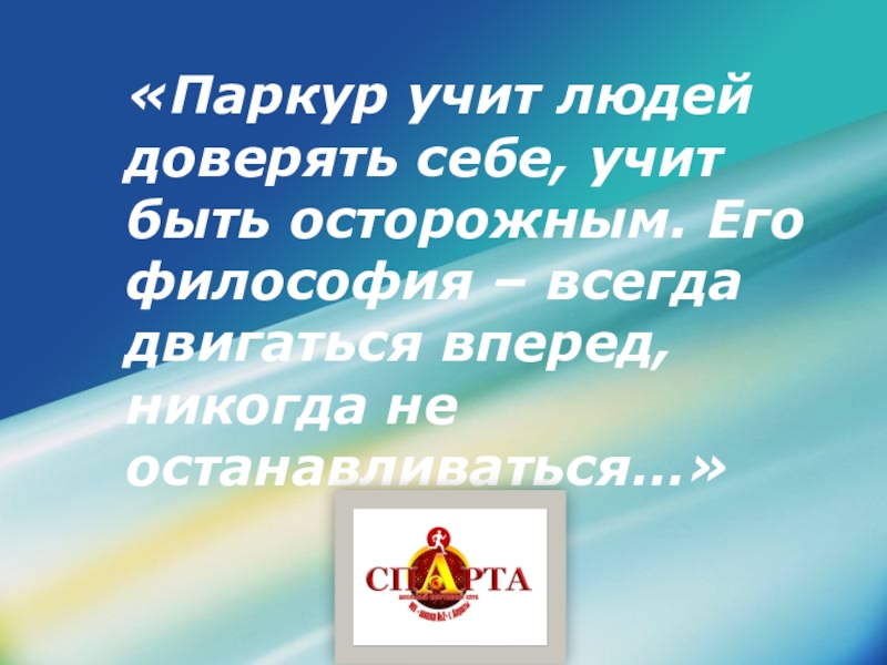 Слайд 21«Паркур учит людей доверять себе, учит быть осторожным. Его философия –