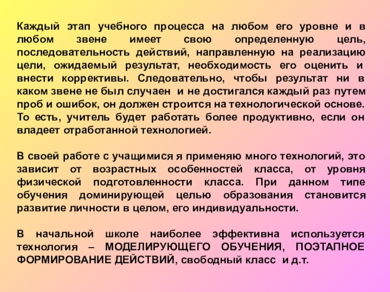 звене имеет свою определенную цель, последовательность действий, направленную на реализацию цели, ожидаемый результат, необходимость его оценить и внести коррективы. Следовательно, чтобы результат ни в каком звене не был случаен и не достигался каждый раз путем проб и ошибок, он должен строится на технологической основе. То есть, учитель будет работать более продуктивно, если он владеет отработанной технологией.
