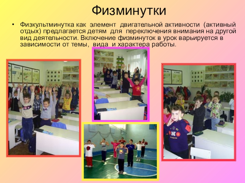внимания на другой вид деятельности. Включение физминуток в урок варьируется в зависимости от темы, вида и характера работы.