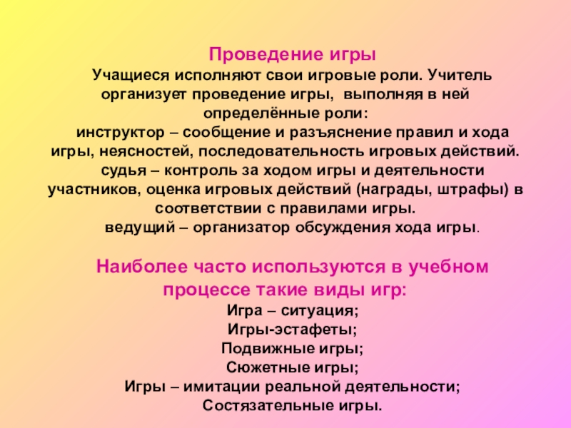 инструктор – сообщение и разъяснение правил и хода игры, неясностей, последовательность игровых действий.