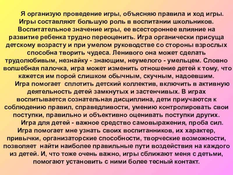 Игра для детей - важное средство самовыражения, проба сил. Игра помогает мне узнать своих воспитанников, их характер, привычки, организаторские способности, творческие возможности, позволяет найти наиболее правильные пути воздействия на каждого из детей. И, что тоже очень важно, игры сближают меня с детьми, помогают установить с ними более тесный контакт.
