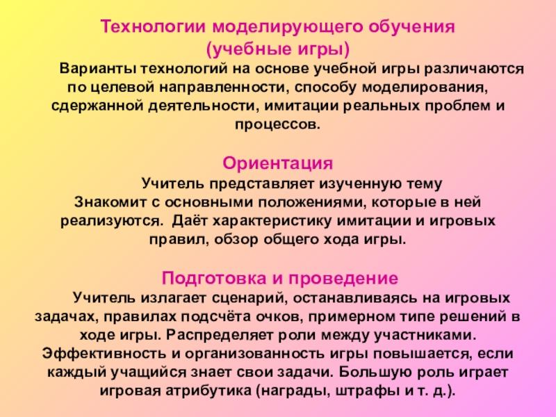 целевой направленности, способу моделирования, сдержанной деятельности, имитации реальных проблем и процессов.