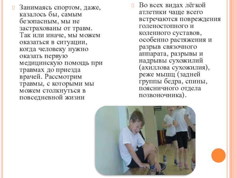 Во всех видах лёгкой атлетики чаще всего встречаются повреждения голеностопного и коленного суставов, особенно растяжения и разрыв связочного аппарата, разрывы и надрывы сухожилий (ахиллова сухожилия), реже мышц (задней группы бедра, спины, поясничного отдела позвоночника).