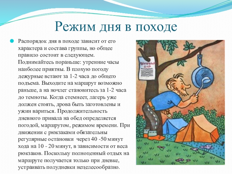 и состава группы, но общее правило состоит в следующем. Поднимайтесь пораньше: утренние часы наиболее приятны. В плохую погоду дежурные встают за 1-2 часа до общего подъема. Выходите на маршрут возможно раньше, а на ночлег становитесь за 1-2 часа до темноты. Когда стемнеет, лагерь уже должен стоять, дрова быть заготовлены и ужин вариться. Продолжительность дневного привала на обед определяется погодой, маршрутом, режимом времени. При движении с рюкзаками обязательны регулярные остановки через 40 -50 минут хода на 10 - 20 минут, в зависимости от веса рюкзаков. Поскольку полноценный отдых на маршруте получается только при дневке, устраивать полудневки нецелесообразно.