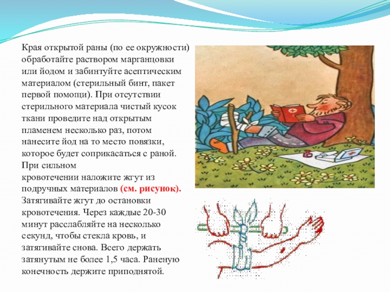 Слайд 16Края открытой раны (по ее окружности) обработайте раствором марганцовки или йодом