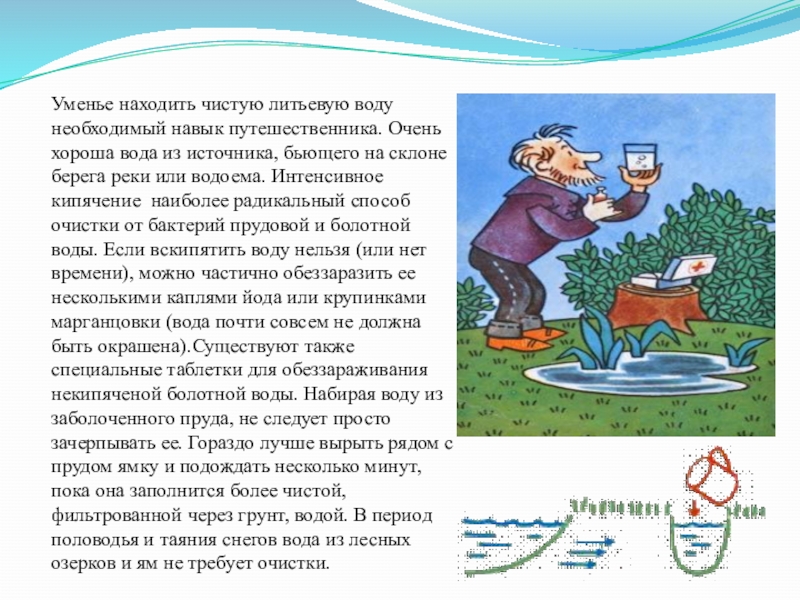Слайд 24Уменье находить чистую литьевую воду необходимый навык путешественника. Очень хороша вода