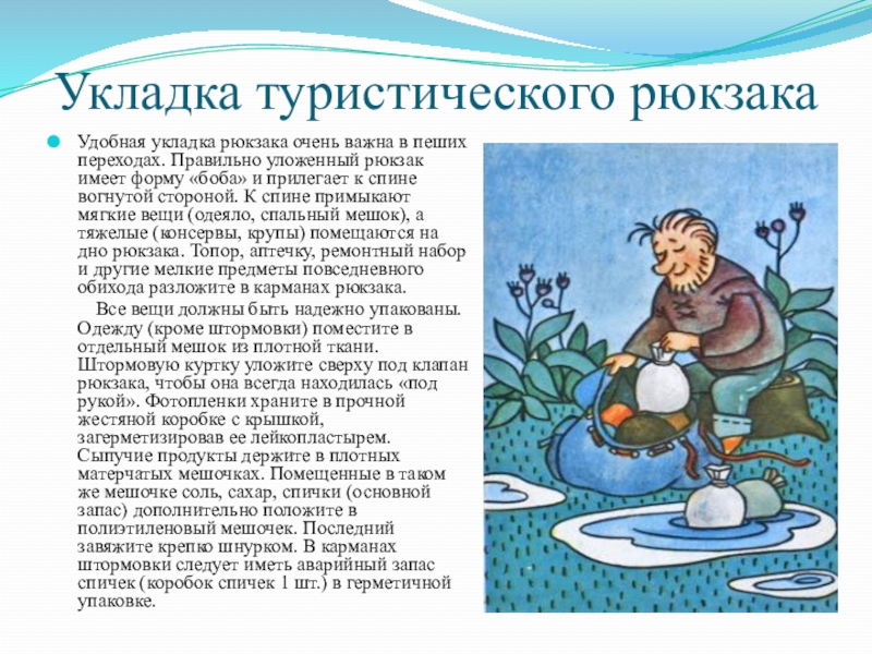 уложенный рюкзак имеет форму «боба» и прилегает к спине вогнутой стороной. К спине примыкают мягкие вещи (одеяло, спальный мешок), а тяжелые (консервы, крупы) помещаются на дно рюкзака. Топор, аптечку, ремонтный набор и другие мелкие предметы повседневного обихода разложите в карманах рюкзака.