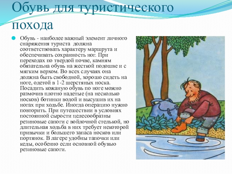 должна соответствовать характеру маршрута и обеспечивать сохранность ног. При переходах по твердой почве, камням обязательна обувь на жесткой подошве и с мягким верхом. Во всех случаях она должна быть свободной, хорошо сидеть на ноге, одетой в 1-2 шерстяных носка. Посадить кожаную обувь по ноге можно размочив плотно надетые (на несколько носков) ботинки водой и высушив их на ногах при ходьбе. Иногда операцию нужно повторить. При путешествии в условиях постоянной сырости целесообразны резиновые сапоги с войлочной стелькой, но длительная ходьба в них требует некоторой привычки и большего запаса носков или портянок. В лагере удобны тапочки или кеды, особенно если основной обувью резиновые сапоги.