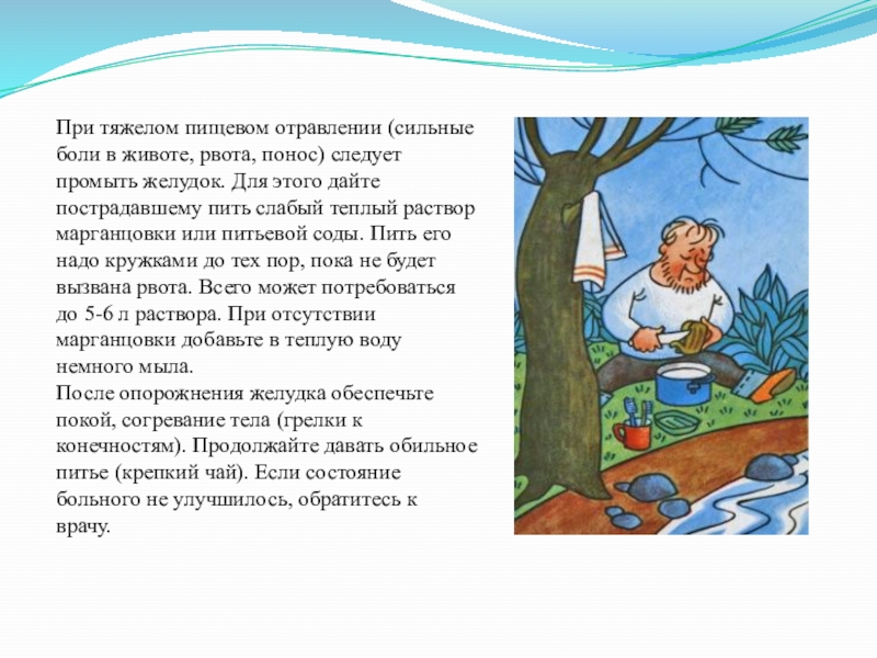 Слайд 12При тяжелом пищевом отравлении (сильные боли в животе, рвота, понос) следует