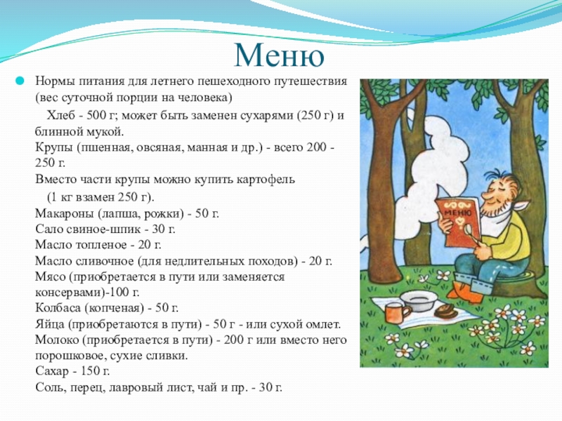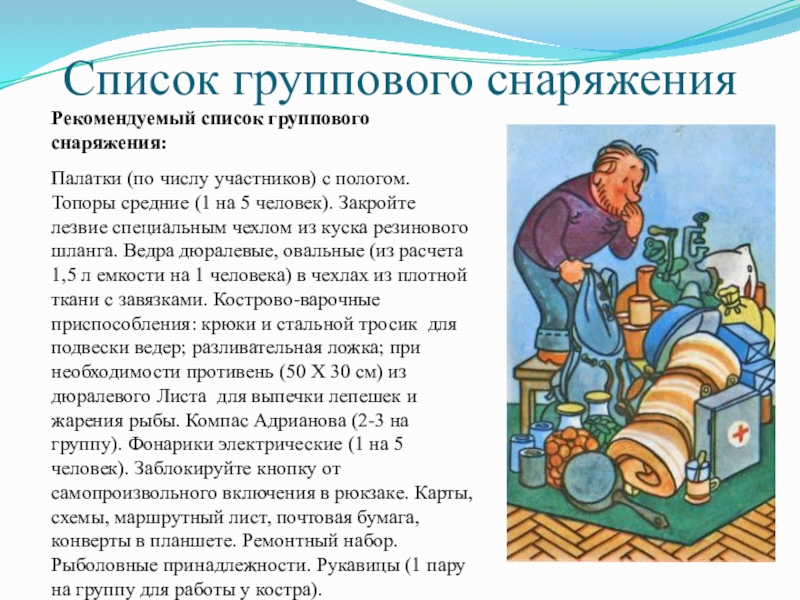 пологом. Топоры средние (1 на 5 человек). Закройте лезвие специальным чехлом из куска резинового шланга. Ведра дюралевые, овальные (из расчета 1,5 л емкости на 1 человека) в чехлах из плотной ткани с завязками. Кострово-варочные приспособления: крюки и стальной тросик для подвески ведер; разливательная ложка; при необходимости противень (50 X 30 см) из дюралевого Листа для выпечки лепешек и жарения рыбы. Компас Адрианова (2-3 на группу). Фонарики электрические (1 на 5 человек). Заблокируйте кнопку от самопроизвольного включения в рюкзаке. Карты, схемы, маршрутный лист, почтовая бумага, конверты в планшете. Ремонтный набор. Рыболовные принадлежности. Рукавицы (1 пару на группу для работы у костра).