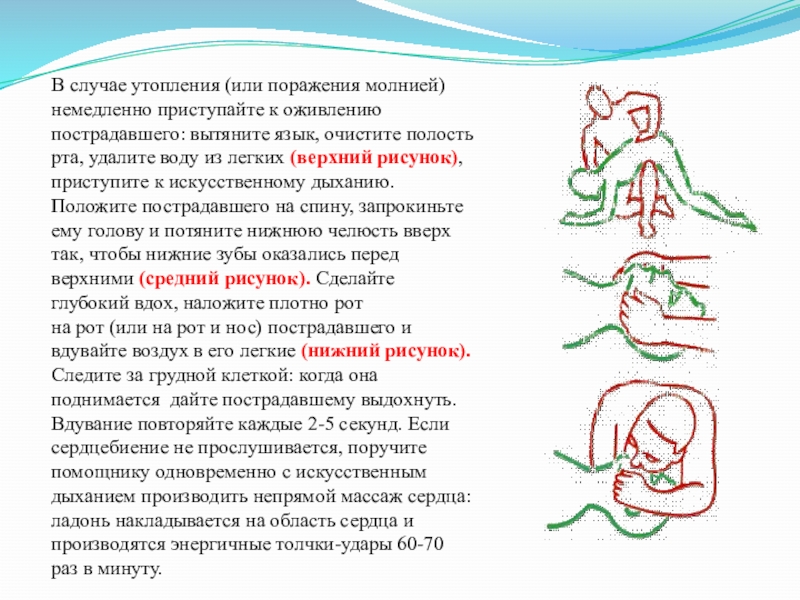 Слайд 15В случае утопления (или поражения молнией) немедленно приступайте к оживлению пострадавшего: