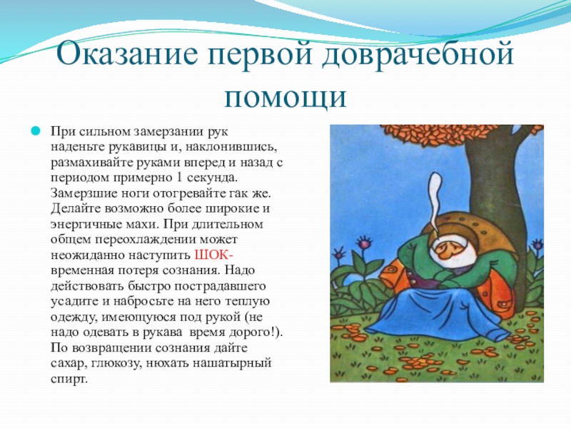 размахивайте руками вперед и назад с периодом примерно 1 секунда. Замерзшие ноги отогревайте гак же. Делайте возможно более широкие и энергичные махи. При длительном общем переохлаждении может неожиданно наступить ШОК- временная потеря сознания. Надо действовать быстро пострадавшего усадите и набросьте на него теплую одежду, имеющуюся под рукой (не надо одевать в рукава время дорого!). По возвращении сознания дайте сахар, глюкозу, нюхать нашатырный спирт.