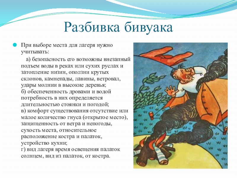 в) комфорт существования отсутствие или малое количество гнуса (открытое место), защищенность от ветра и непогоды, сухость места, относительное расположение костра и палаток, устройство кухни;