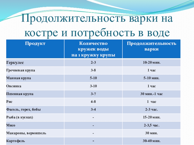 Слайд 28Продолжительность варки на костре и потребность в воде