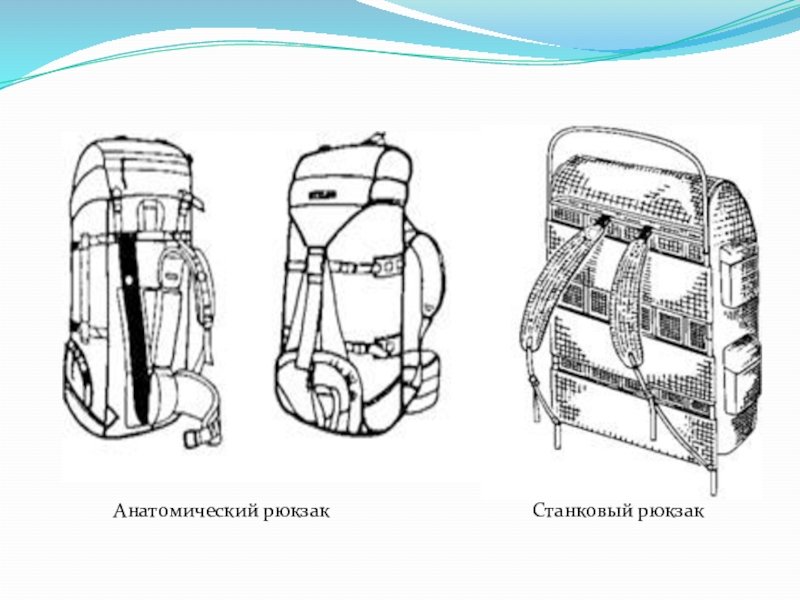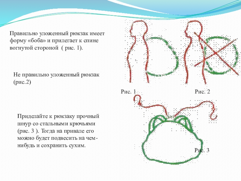 Слайд 7Правильно уложенный рюкзак имеет форму «боба» и прилегает к спине вогнутой