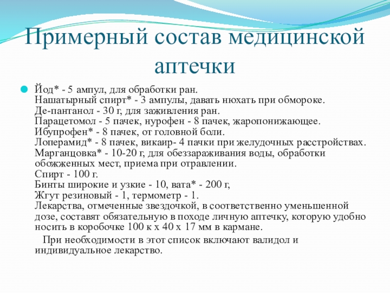 Лекарства, отмеченные звездочкой, в соответственно уменьшенной дозе, составят обязательную в походе личную аптечку, которую удобно носить в коробочке 100 к х 40 х 17 мм в кармане.