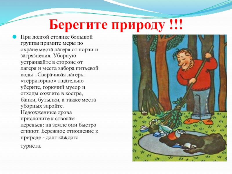 места лагеря от порчи и загрязнения. Уборную устраивайте в стороне от лагеря и места забора питьевой воды . Сворачивая лагерь. «территорию» тщательно уберите, горючий мусор и отходы сожгите в костре, банки, бутылки, а также места уборных заройте. Недожженные дрова прислоните к стволам деревьев: на земле они быстро сгниют. Бережное отношение к природе - долг каждого туриста.