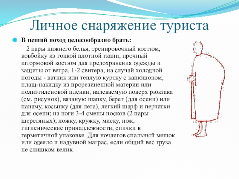 костюм, ковбойку из тонкой плотной ткани, прочный штормовой костюм для предохранения одежды и защиты от ветра, 1-2 свитера, на случай холодной погоды - ватник или теплую куртку с капюшоном, плащ-накидку из прорезиненной материи или полиэтиленовой пленки, надеваемую поверх рюкзака (см. рисунок), вязаную шапку, берет (для осени) или панаму, косынку (для лета), легкий шарф и перчатки для осени; на ноги 3-4 смены носков (2 пары шерстяных); ложку, кружку, миску, нож, гигиенические принадлежности, спички в герметичной упаковке. Для ночлегов спальный мешок или одеяло и надувной матрас, если общий вес груза не слишком велик.