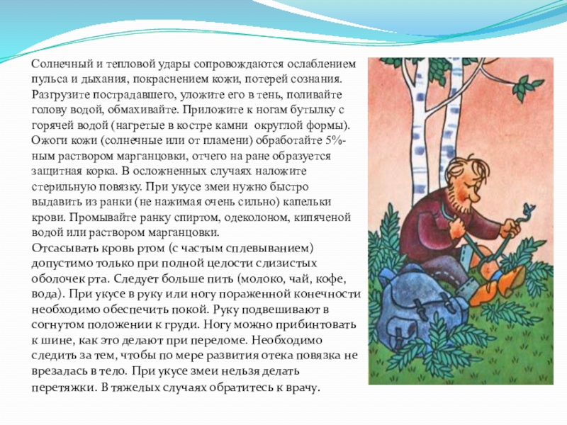 потерей сознания. Разгрузите пострадавшего, уложите его в тень, поливайте голову водой, обмахивайте. Приложите к ногам бутылку с горячей водой (нагретые в костре камни округлой формы).Ожоги кожи (солнечные или от пламени) обработайте 5%-ным раствором марганцовки, отчего на ране образуется защитная корка. В осложненных случаях наложите стерильную повязку. При укусе змеи нужно быстро выдавить из ранки (не нажимая очень сильно) капельки крови. Промывайте ранку спиртом, одеколоном, кипяченой водой или раствором марганцовки.