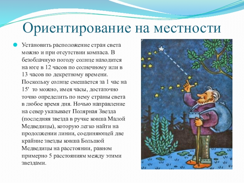 В безоблачную погоду солнце находится на юге в 12 часов по солнечному или в 13 часов по декретному времени. Поскольку солнце смешается за 1 час на 15' то можно, имея часы, достаточно точно определить по нему страны света в любое время дня. Ночью направление на север указывает Полярная Звезда (последняя звезда в ручке ковша Малой Медведицы), которую легко найти на продолжении линии, соединяющей две крайние звезды ковша Большой Медведицы на расстоянии, равном примерно 5 расстояниям между этими звездами.