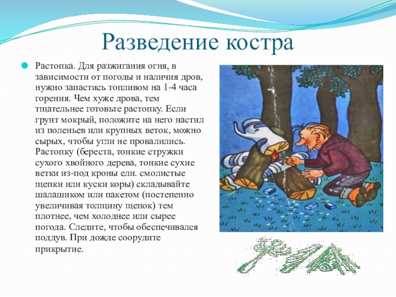 дров, нужно запастись топливом на 1-4 часа горения. Чем хуже дрова, тем тщательнее готовьте растопку. Если грунт мокрый, положите на него настил из поленьев или крупных веток, можно сырых, чтобы угли не провалились. Растопку (береста, тонкие стружки сухого хвойного дерева, тонкие сухие ветки из-под кроны ели. смолистые щепки или куски коры) складывайте шалашиком или пакетом (постепенно увеличивая толщину щепок) тем плотнее, чем холоднее или сырее погода. Следите, чтобы обеспечивался поддув. При дожде соорудите прикрытие.