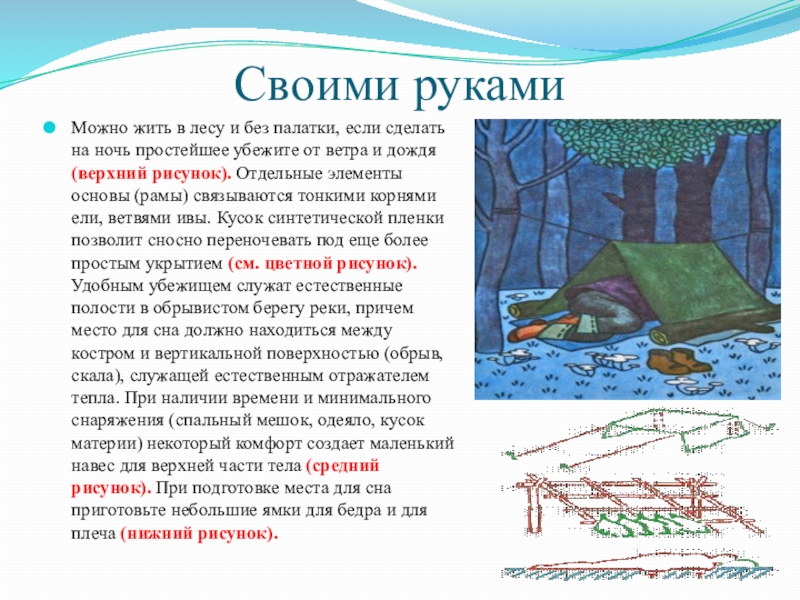 ночь простейшее убежите от ветра и дождя (верхний рисунок). Отдельные элементы основы (рамы) связываются тонкими корнями ели, ветвями ивы. Кусок синтетической пленки позволит сносно переночевать под еще более простым укрытием (см. цветной рисунок). Удобным убежищем служат естественные полости в обрывистом берегу реки, причем место для сна должно находиться между костром и вертикальной поверхностью (обрыв, скала), служащей естественным отражателем тепла. При наличии времени и минимального снаряжения (спальный мешок, одеяло, кусок материи) некоторый комфорт создает маленький навес для верхней части тела (средний рисунок). При подготовке места для сна приготовьте небольшие ямки для бедра и для плеча (нижний рисунок).