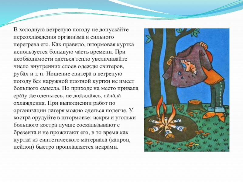 Слайд 13В холодную ветреную погоду не допускайте переохлаждения организма и сильного перегрева
