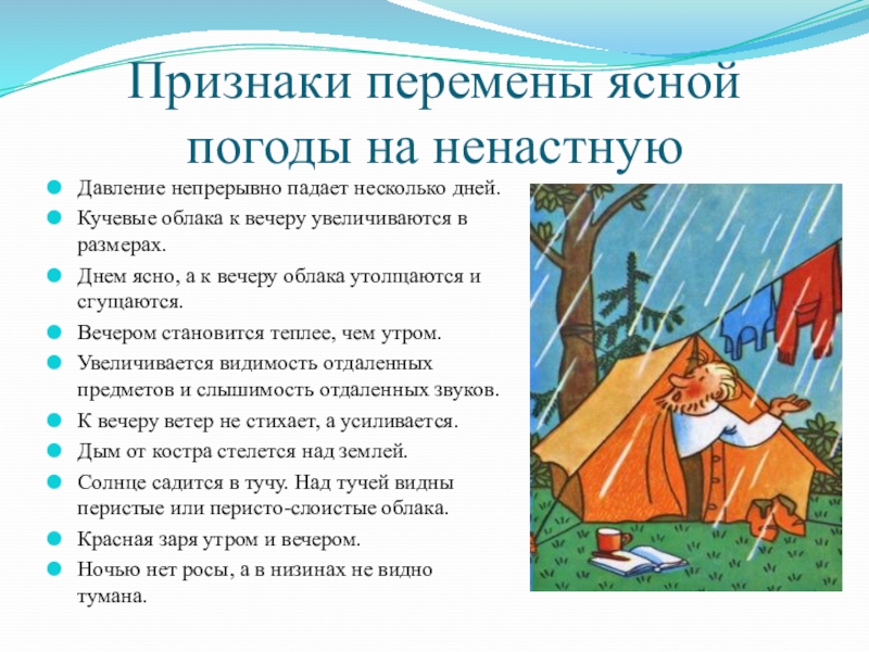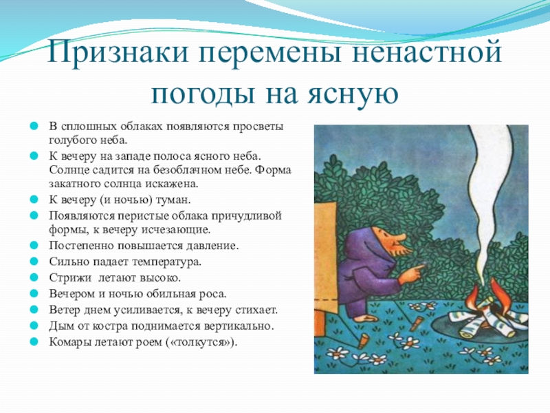 Слайд 20Признаки перемены ненастной погоды на ясную