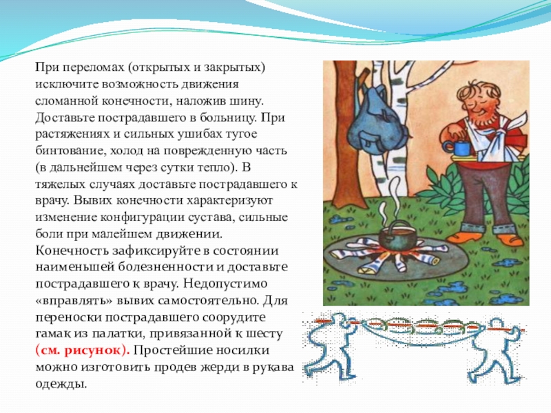 шину. Доставьте пострадавшего в больницу. При растяжениях и сильных ушибах тугое бинтование, холод на поврежденную часть (в дальнейшем через сутки тепло). В тяжелых случаях доставьте пострадавшего к врачу. Вывих конечности характеризуют изменение конфигурации сустава, сильные боли при малейшем движении. Конечность зафиксируйте в состоянии наименьшей болезненности и доставьте пострадавшего к врачу. Недопустимо «вправлять» вывих самостоятельно. Для переноски пострадавшего соорудите гамак из палатки, привязанной к шесту (см. рисунок). Простейшие носилки можно изготовить продев жерди в рукава одежды.