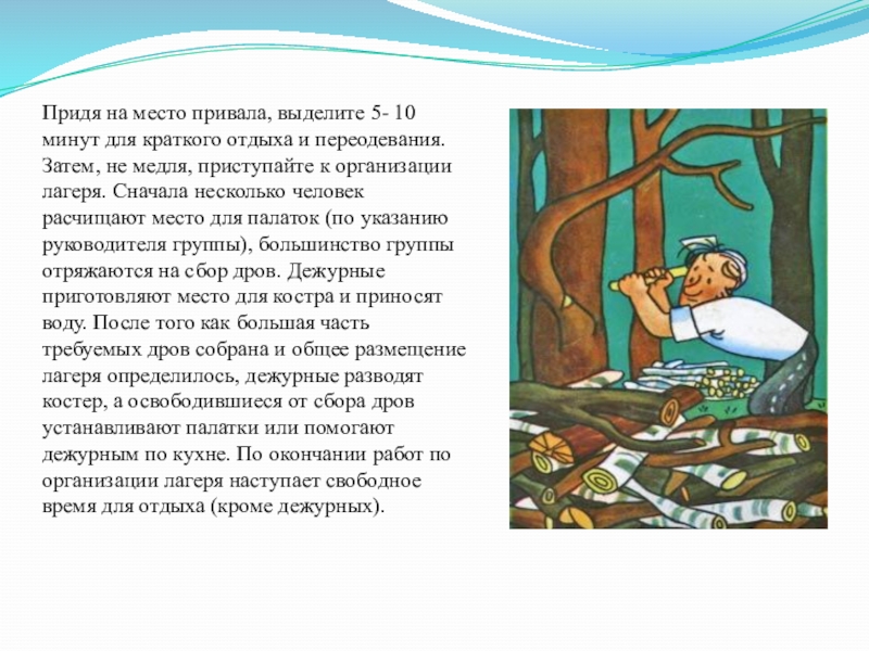 Слайд 23Придя на место привала, выделите 5- 10 минут для краткого отдыха