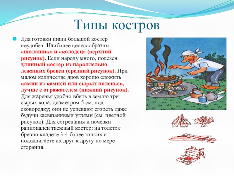 Для готовки пищи большой костер неудобен. Наиболее целесообразны «шалашик» и