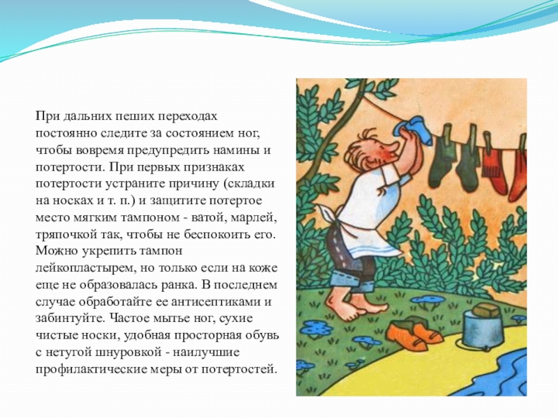 Слайд 14При дальних пеших переходах постоянно следите за состоянием ног, чтобы вовремя