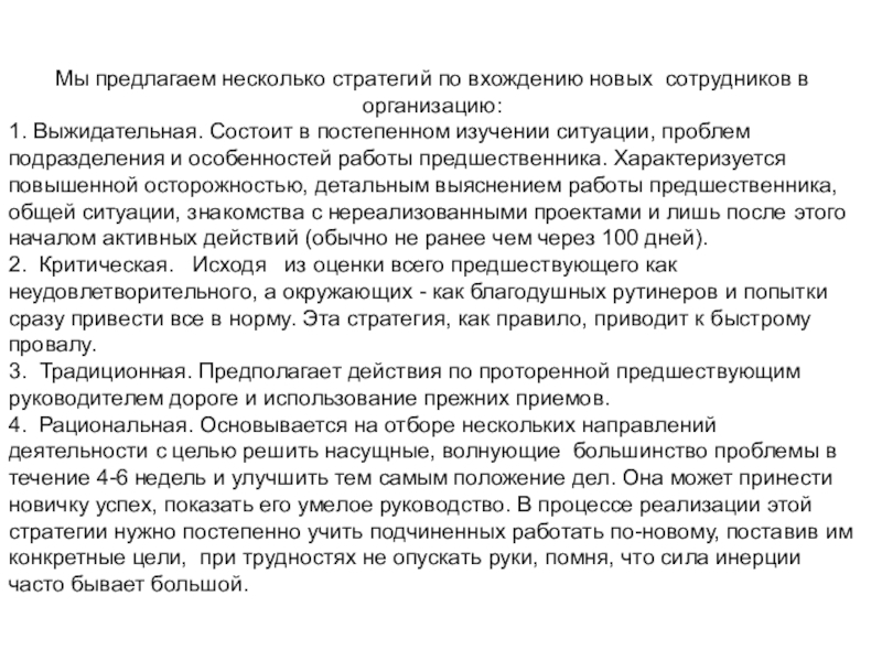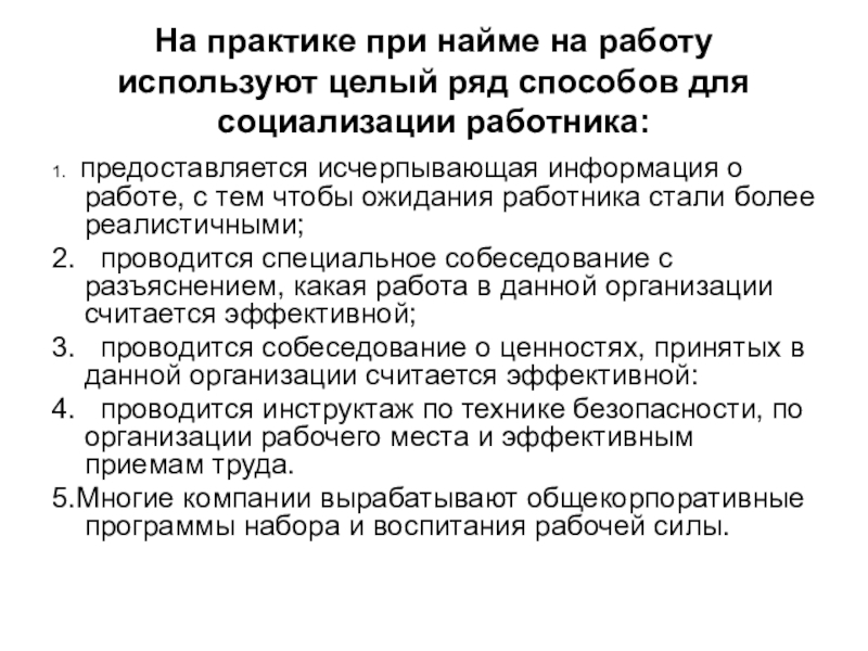 1. предоставляется исчерпывающая информация о работе, с тем чтобы ожидания работника стали более реалистичными;